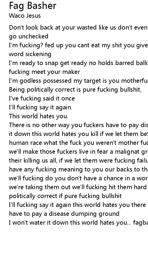 There is no other way you fuckers have to pay disease dumping ground won't water it down this world hates you kill if we let them before they fucking kill the human race what the fuck you weren't mother fucking queer their killing us all we'll make those fuckers live in fear a malignat growth a fucked up subculture their killing us all, if we let them were fucking failures do the words fuck off have any fucking meaning to you our backs to the wall there's no limit to what we'll fucking do you don't have a chance in a world that fucking hates your ass we're taking them out we'll fucking hit them hard and hit them fast being politically correct if pure fucking bullshit |