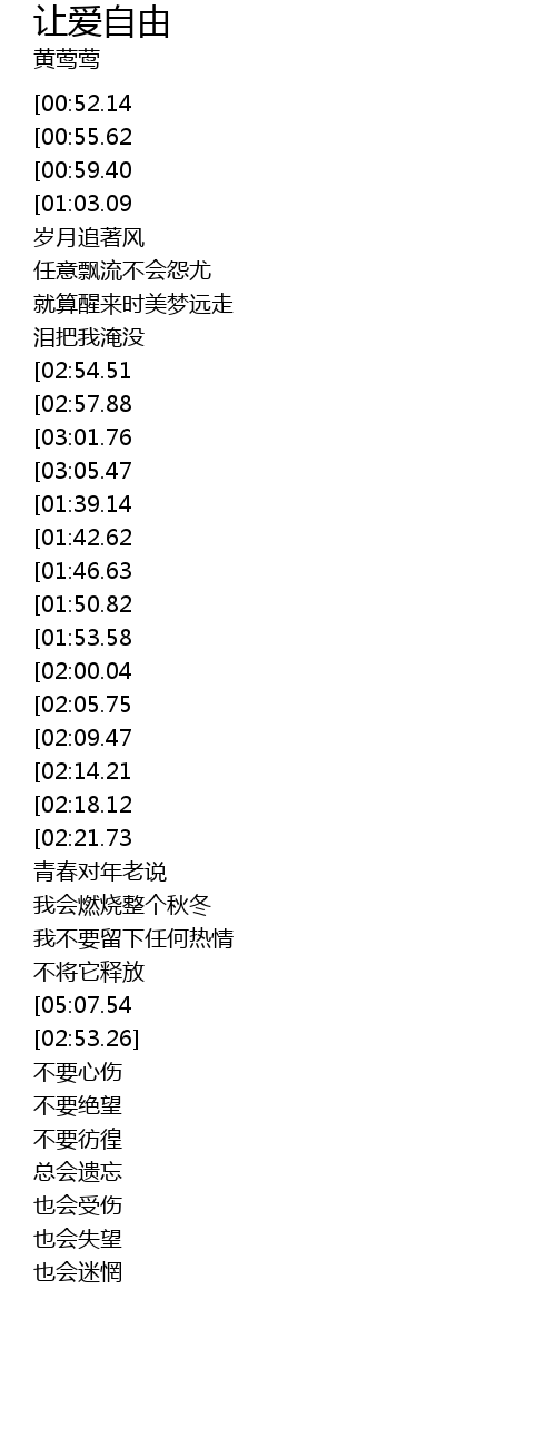 | [05:15.25][05:07.54][05:03.51][04:59.75][02:40.63] | 让爱自由 |