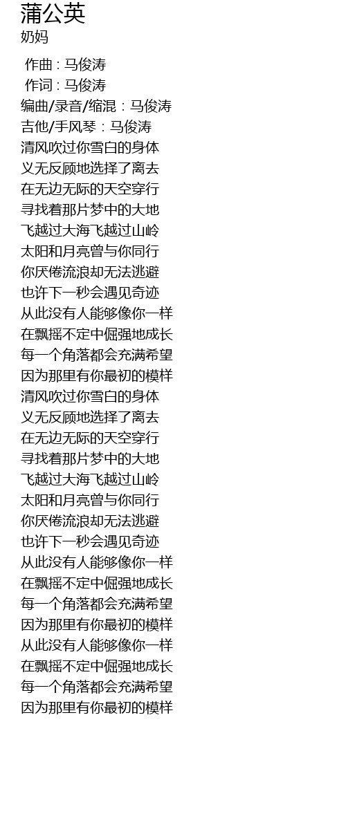 | [00:04.18] | 编曲/录音/缩混:马俊涛 |