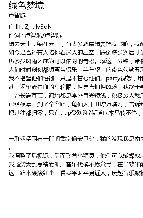 | xiǎng qù tiān shàng, tǎng zài yún shàng, yǒu tài duō è mó xiǎng yào bǎ wǒ yǐng xiǎng, wǒ yùn niàng, zhèng néng liàng lái dǐ dǎng, rén zào rén de sī xiǎng, rú guǒ kě yǐ néng fǒu jiè wǒ yí gè lǜ sè mèng xiǎng. rú jīn shì fǒu hái yǒu rén péi nǐ kàn mí rén de xīng kōng, diē dǎo duō shǎo cì hòu cái shì zhe xīng sōng, jīng lì duō shǎo fēng yǔ cái chéng wéi kě yǐ yī fù de qīng sōng. jiù zhè sān fēn zhōng, dài nǐ men jìn rù mèng jìng zhōng, gēn wǒ áo yóu hǎi lù kòng, tiào wǔ zài guǎng hán gōng, diào hiphop de jiāng tài gōng, wǒ hé hiphop dōu lè yú qí zhōng, dā yìng tā bú huì yǒu shǐ wú zhōng, dā yìng zì jǐ wǔ yùn jiē kōng, kàn wǒ yòng shuō chàng dà nào tiān gōng. rén men shí shí kè kè dōu xiǎng lí kǔ dé lè, yáng chē wàng xìng de yè sè gōu lè chǒu è, kāi shǐ yú lè, kāi shǐ fù hè, suí shí nù hè, suí shí wù sè, lǜ sè de mèng zhǐ liú xià yī zhāng pū kè, nán dào liáng chén měi jǐng dōu shì xū shè? wǒ bù zhǐ wàng tā men wù chè, zhǐ shì bù gān xīn tā men kāi party zhù hè, yòng fèn zi qián tián bǎo è mó dù è, zhēn zhèng de yíng zhě kāi táng shǒu jié kè. wǔ shì kě wàng liú zhe xuè de xiě lún yǎn, dàn shì hài pà dān fēng xiǎn, wǒ zhōng yú dào le lín jiè diǎn, shàng dì zhǎng mǎn ěr jiǎn, biàn dì dōu shì lǐ mì mù guāng duǎn qiǎn, jī jí fèi rén chóu méi kǔ liǎn, zhǐ yǒu yè láng cái huì zhǐ zhǐ diǎn diǎn, miàn duì cuò wù zhē zhē yǎn yǎn. yǐ jīng yè mù, dào le gè chà lù, guī xiān rén qiān dīng níng wàn zhǔ fù, gào sù wǒ yī tiáo huáng quán lù, yī tiáo bù guī lù, wǒ yī jiǎo shā zhù, dùn shí dùn wù, zhuàng làn le zhōng jiān de sī wéi shù. jǐ zhǐ wū yā dǎng zhù qián fāng shì xiàn gòng wǔ, guān diào Lisa de yǒng mián quán shì luò lèi yīn fú, míng rén zài mí wù de yuǎn chù nà hǎn gào sù wǒ zhōng le yuè dú, yuè shì sī kǎo yuè shì tòng kǔ, jí lè shì jiè wú yǒu zhòng kǔ, zài lǜ sè mèng jìng lǐ zhòng dú.? bǎ guò wǎng dōu guī líng, zhǐ yǒu trap shòu huān yíng? jiē dào de mù mǎ zhuǎn bù tíng, pèi shàng de yīn yuè yòu lù míng, wǒ zǒu jìn le diàn huà tíng, bō hào dǎ gěi sòng yuè tíng, nà tóu chuán lái le màn tuó líng. | |
