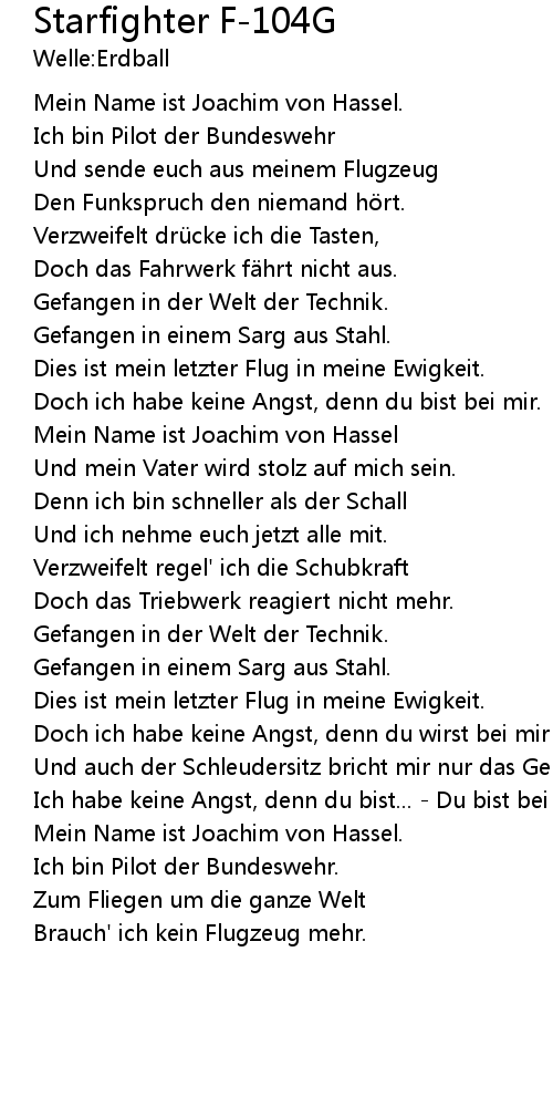 | Und auch der Schleudersitz bricht mir nur das Genick. | |