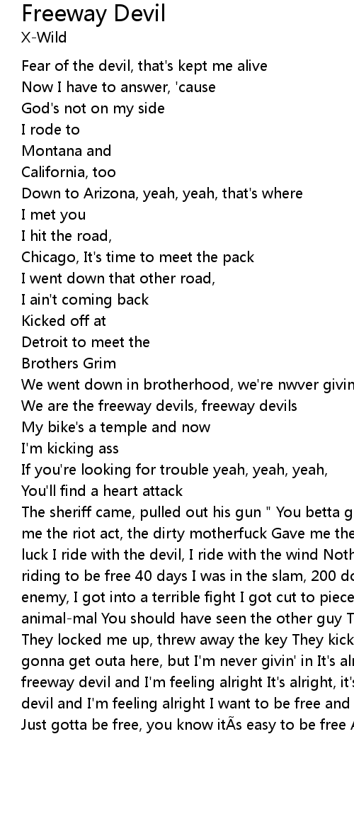 | The sheriff came, pulled out his gun " You betta get outa town quot He read me the riot act, the dirty motherfuck Gave me the third degree and now I' m outta luck I ride with the devil, I ride with the wind Nothing' s gonna stop me From riding to be free 40 days I was in the slam, 200 dollars light I got myself an enemy, I got into a terrible fight I got cut to pieces, yeah, but I' m an animalmal You should have seen the other guy They put him straight in the can They locked me up, threw away the key They kicked my bike to shit I' m never gonna get outa here, but I' m never givin' in It' s alright, it' s alright I' m a freeway devil and I' m feeling alright It' s alright, it' s alright I' m a freeway devil and I' m feeling alright I want to be free and I' m free, I know I' m free Just gotta be free, you know it s easy to be free And I' m goddamn free |