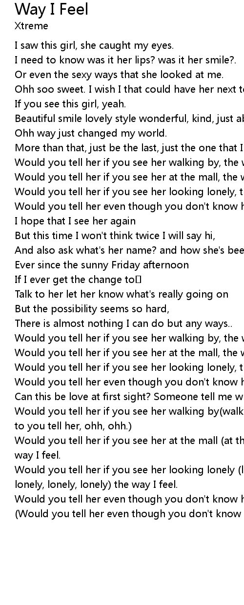| Would you tell her if you see her walking by walking by, the way I feel. would to you tell her, ohh, ohh. | |
