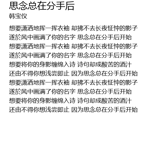 | [00:39.000] | 遂於风中画满了你的名字 思念总在分手后开始 |