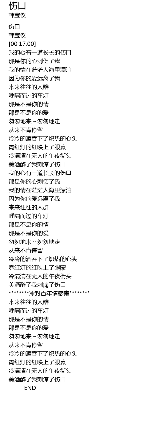 | [00:22.55] | 我的心有一道长长的伤口 |