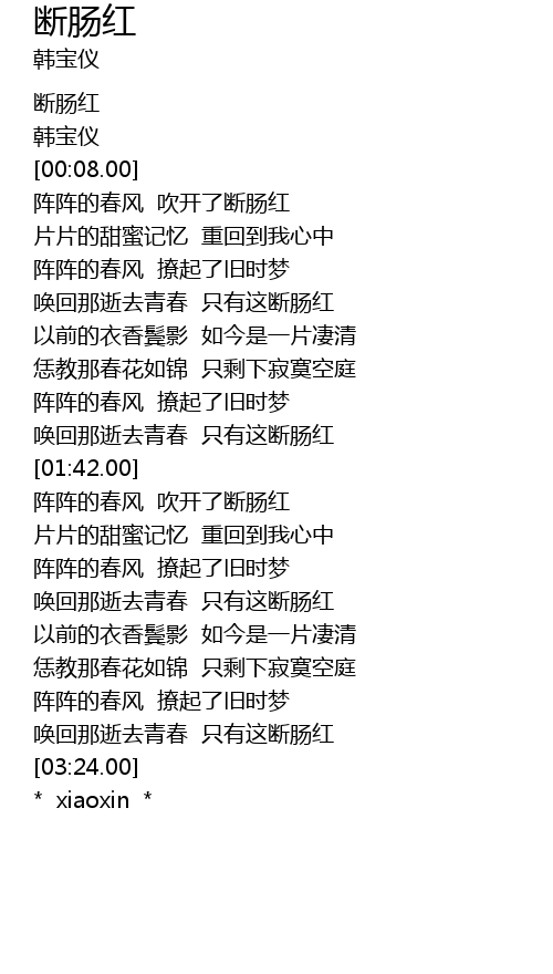 | [01:53.90] | 阵阵的春风 吹开了断肠红 |