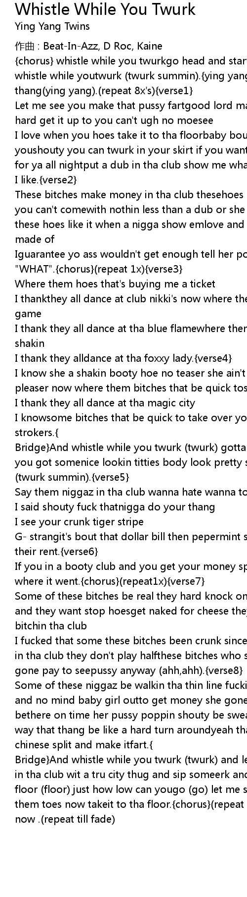 | {chorus} whistle while you twurkgo head and start and make thatpussy fart and whistle while youtwurk (twurk summin).{ying yang twins}ying yang in this thang(ying yang).(repeat 8x's){verse1} | |