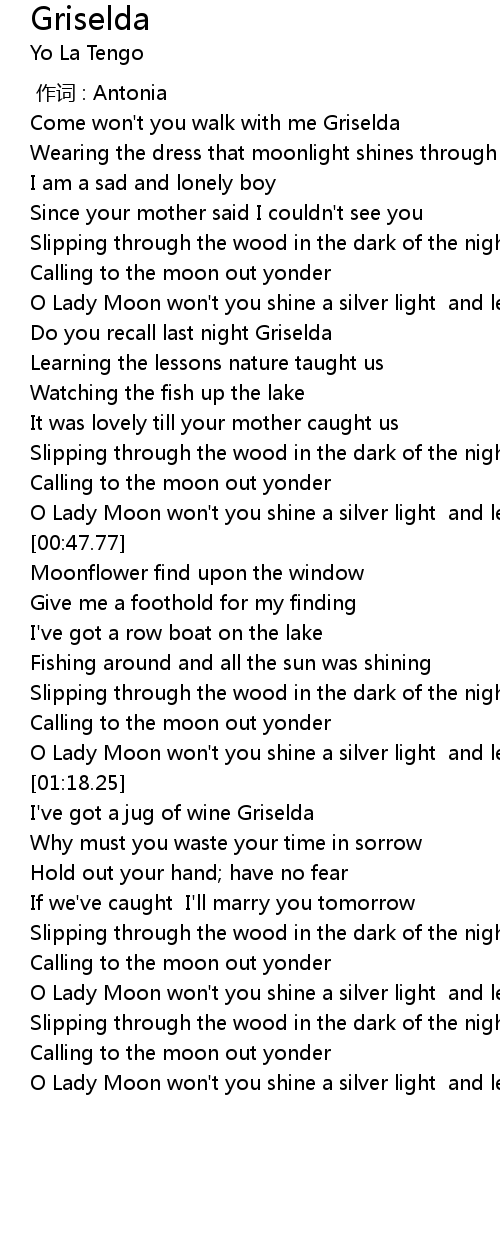 | [00:44.16] | O Lady Moon won't you shine a silver light and lead me to my Griselda |