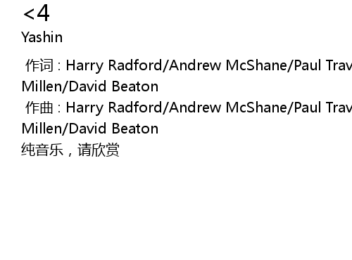 | [00:01.000] | zuo qu : Harry Radford Andrew McShane Paul Travers Kevin Miles Lewis Millen David Beaton |