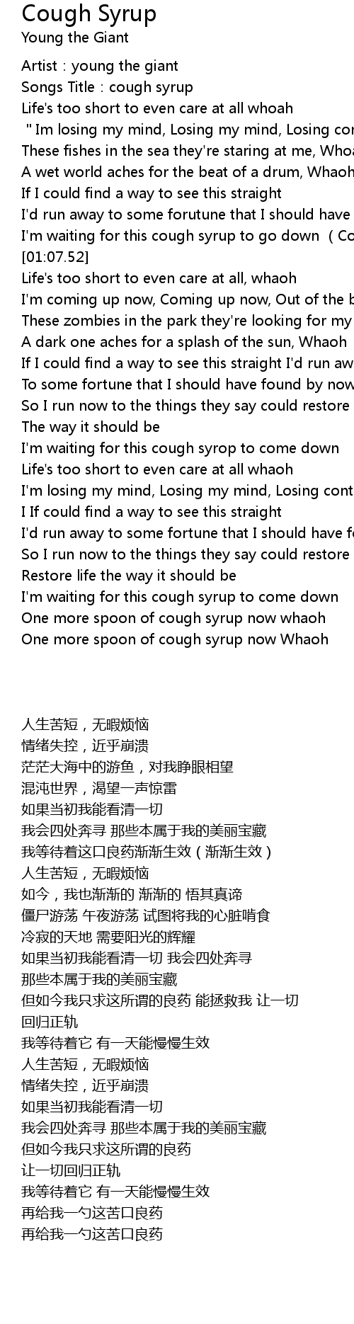 | [00:58.63] | I'm waiting for this cough syrup to go down (Come down).......... |