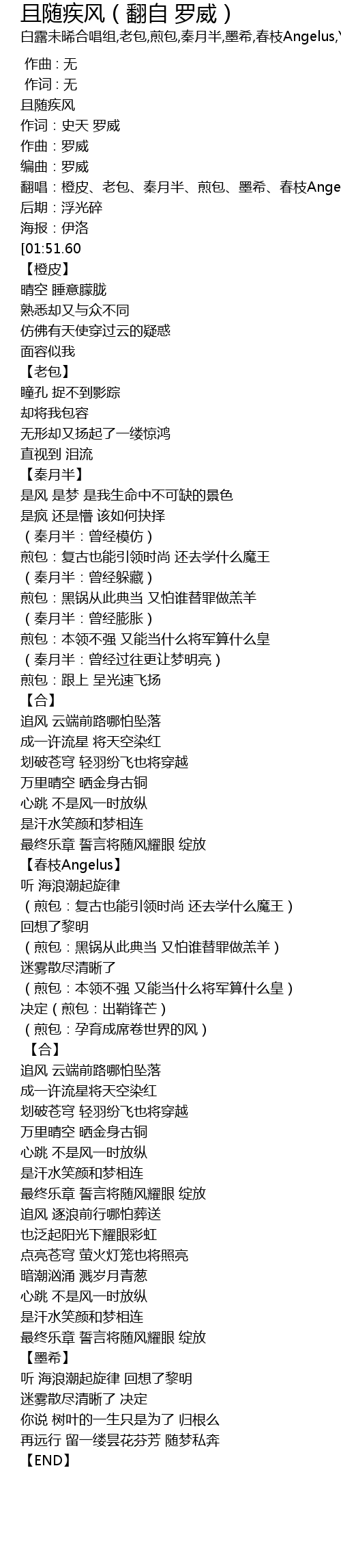 | [02:15.88][01:51.60][00:13.64] | -------------白露未晞合唱组------------- |