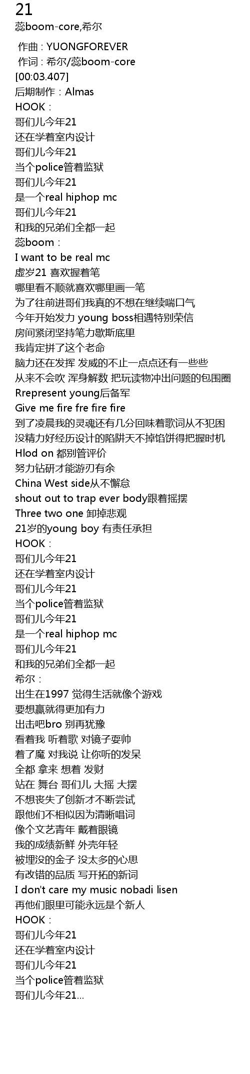 | [00:01.000] | 作词 : 希尔/蕊boom-core |