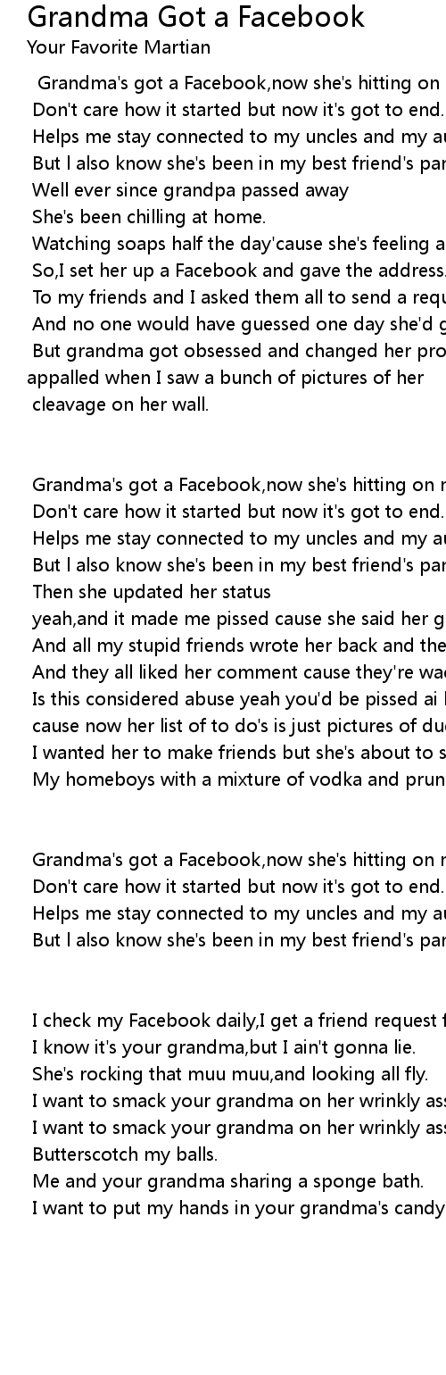 But grandma got obsessed and changed her profile to slutty MCbuttSex and I was appalled when I saw a bunch of pictures of her |
