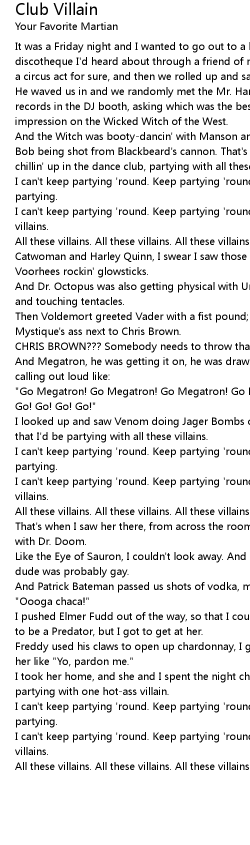 And the Witch was booty-dancin' with Manson and Gannon, right next to Side Show Bob being shot from Blackbeard's cannon. That's when I knew that tonight I'd be chillin' up in the dance club, partying with all these villains. |