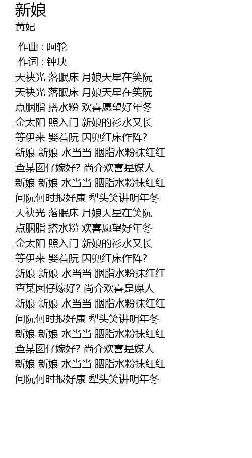 | [02:29.83] | 新娘 新娘 水当当 胭脂水粉抹红红 |