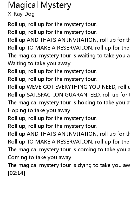 | [00:31] | The magical mystery tour is waiting to take you away, |