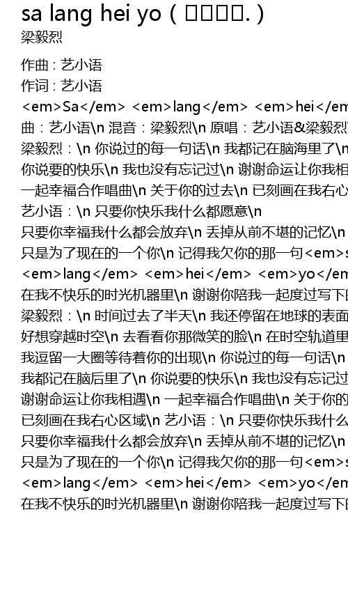 | <em>Sa</em> <em>lang</em> <em>hei</em> <em>yo</em> \n 词:艺小语\n 曲:艺小语\n 混音:梁毅烈\n 原唱:艺小语&梁毅烈\n 梁毅烈:\n 你说过的每一句话\n 我都记在脑海里了\n 你说要的快乐\n 我也没有忘记过\n 谢谢命运让你我相遇\n 一起幸福合作唱曲\n 关于你的过去\n 已刻画在我右心区域\n 艺小语:\n 只要你快乐我什么都愿意\n 只要你幸福我什么都会放弃\n 丢掉从前不堪的记忆\n 只是为了现在的一个你\n 记得我欠你的那一句<em>sa</em> <em>lang</em> <em>hei</em> <em>yo</em>\n 留在时空没有忘记\n 在我不快乐的时光机器里\n 谢谢你陪我一起度过写下的日记\n 梁毅烈:\n 时间过去了半天\n 我还停留在地球的表面\n 好想穿越时空\n 去看看你那微笑的脸\n 在时空轨道里面\n 我逗留一大圈等待着你的出现\n 你说过的每一句话\n 我都记在脑后里了\n 你说要的快乐\n 我也没有忘记过\n 谢谢命运让你我相遇\n 一起幸福合作唱曲\n 关于你的过去\n 已刻画在我右心区域\n 艺小语:\n 只要你快乐我什么都愿意\n 只要你幸福我什么都会放弃\n 丢掉从前不堪的记忆\n 只是为了现在的一个你\n 记得我欠你的那一句<em>sa</em> <em>lang</em> <em>hei</em> <em>yo</em>\n 留在时空没有忘记\n 在我不快乐的时光机器里\n 谢谢你陪我一起度过写下的日记 |
