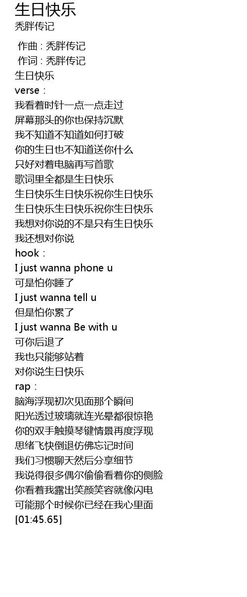 | [00:45.45] | wo xiang dui ni shuo de bu shi zhi you sheng ri kuai le |