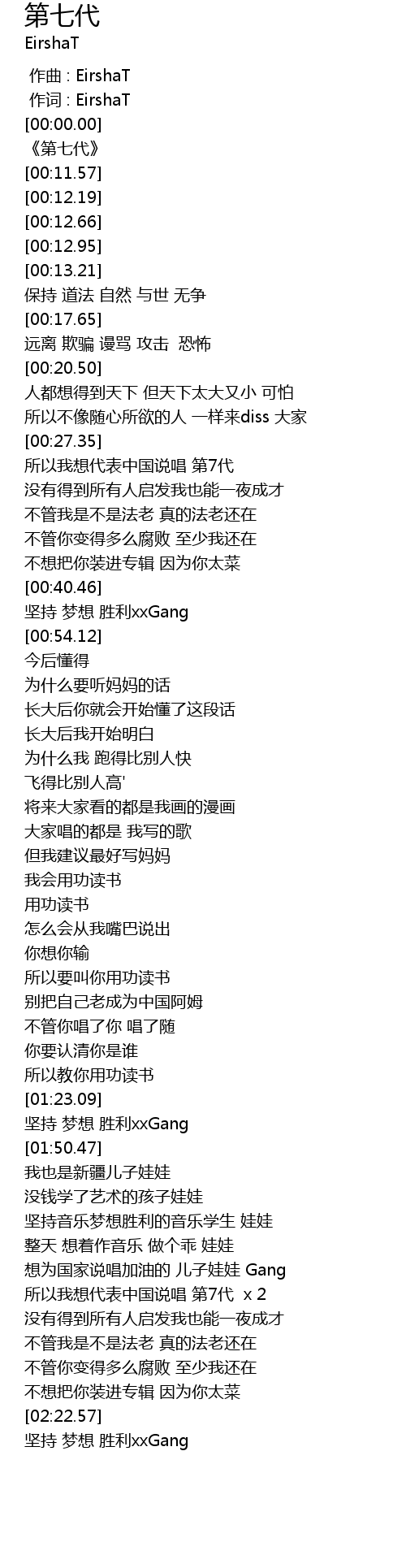| [02:02.95] | 所以我想代表中国说唱 第7代 x 2 |