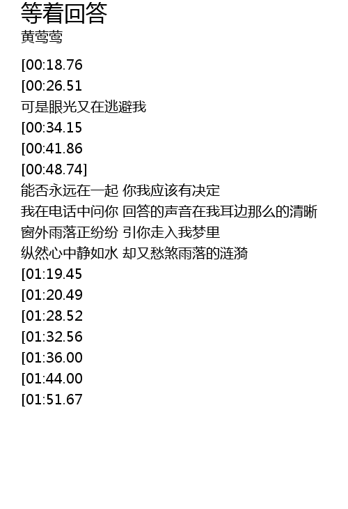 | [02:10.86][00:18.76] | 当我抬头看着你 不禁又要怀疑你 |