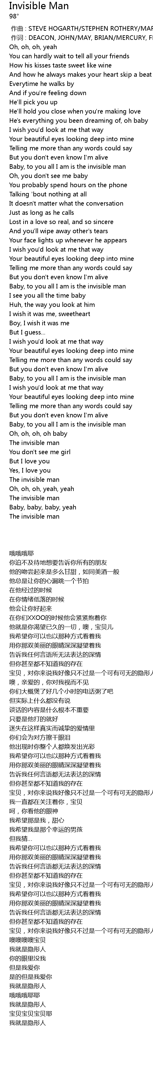 | [00:01.00] | 作词 : DEACON, JOHN/MAY, BRIAN/MERCURY, FREDDIE/TAYLOR, ROGER |