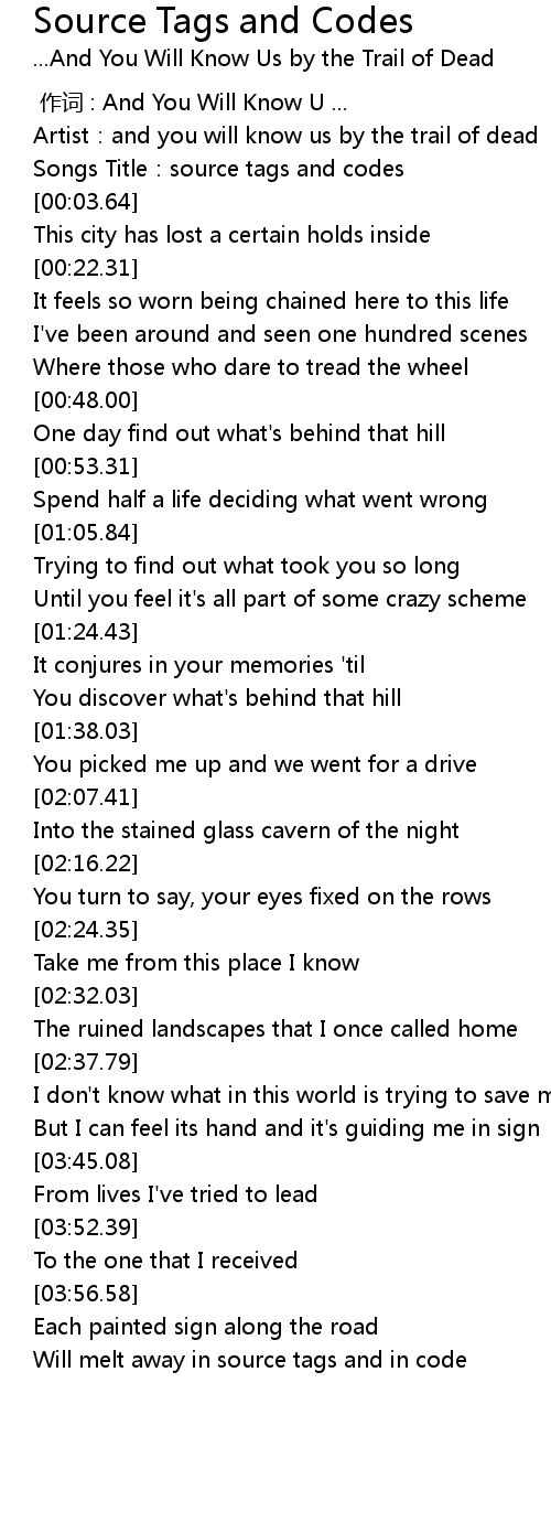 | [00:00.49] | Artist:and you will know us by the trail of dead |