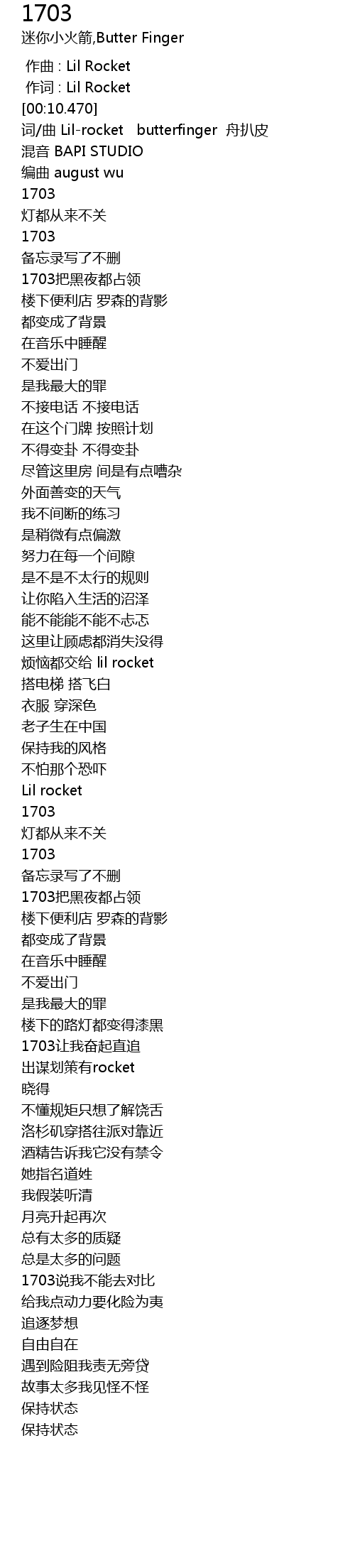 | [00:15.511] | 词/曲 Lil-rocket butterfinger 舟扒皮 |