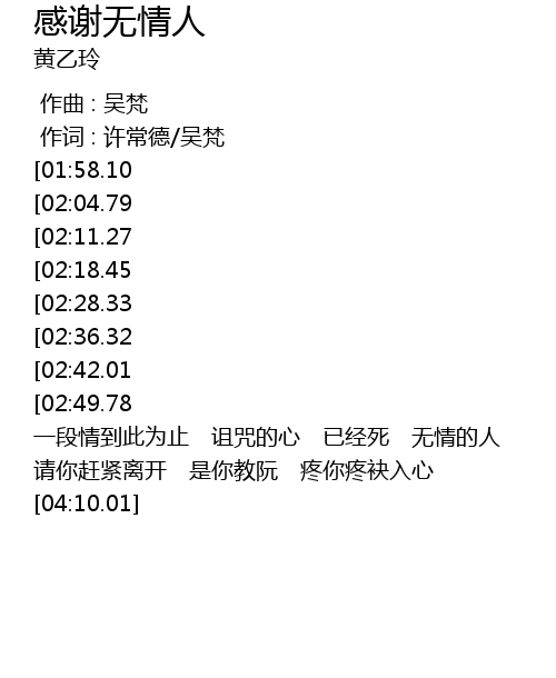 | [01:13.10][02:42.01][03:40.66] | a gan xie wu qing ren bian xin ge lai xiang song |