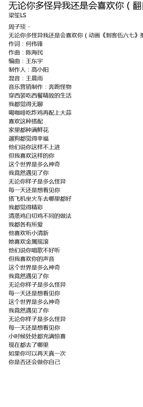 | [0-1:59.400] | 周子琰 - 无论你多怪异我还是会喜欢你(动画《刺客伍六七》推广版片尾曲) |