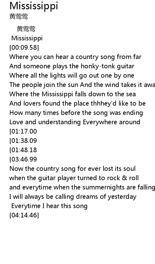 | [03:26.08][01:48.18] | Mississippi you' ll be on my mind Everytime I hear this song |