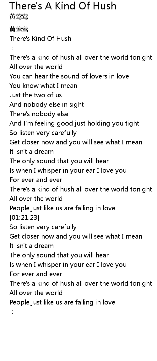 | [00:09.20] | There' s a kind of hush all over the world tonight |