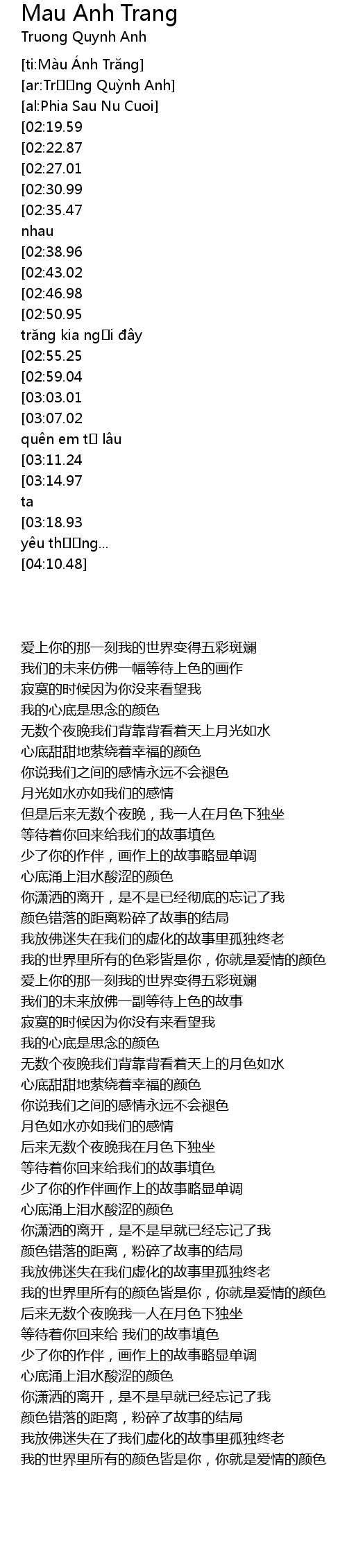 | [00:37.50][02:19.59] | Biết yêu anh là trái tim em muôn màu đổi thay |