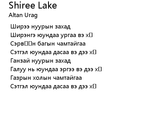 | [01:01.802] | Ширэнгэ юундаа ургаа вэ хө |