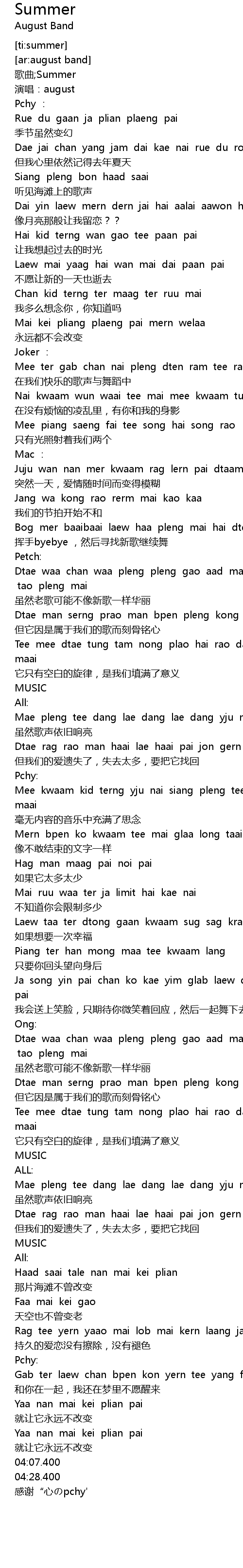 | [01:24.82] | Dtae waa chan waa pleng pleng gao aad mai te mai tan samai tao pleng mai |