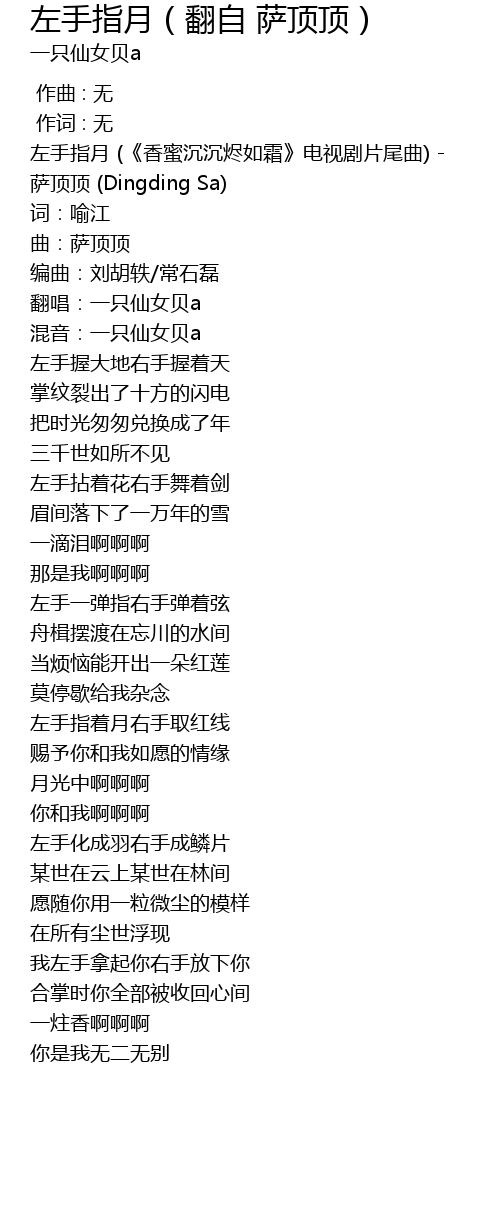 | [00:01.04] | 左手指月 (《香蜜沉沉烬如霜》电视剧片尾曲) - 萨顶顶 (Dingding Sa) |