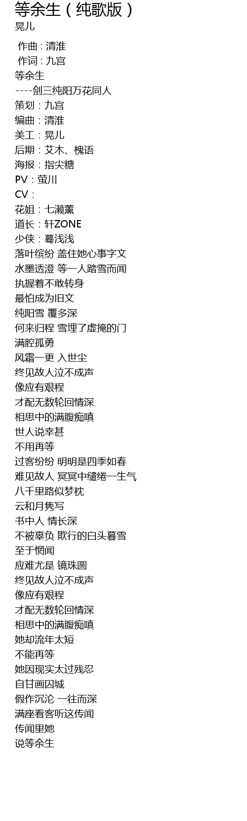| Album | 剑三纯阳万花·剧情歌《等余生》 |