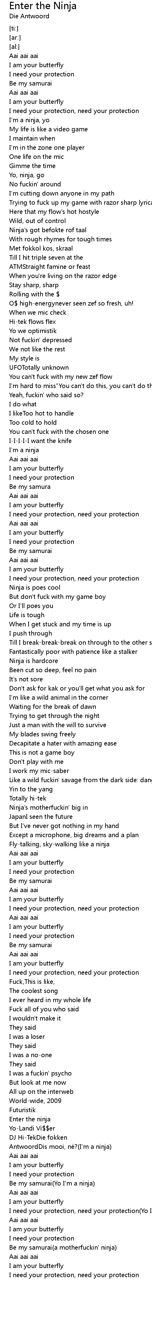 | [00:54.78] | Ninja' s got befokte rof taal |