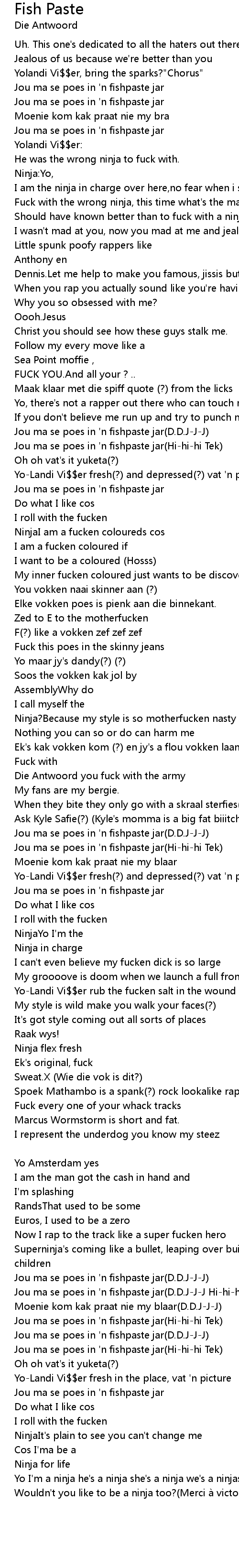 | Jou ma se poes in ' n fishpaste jar D. D. JJJ Hihihi Tek | |