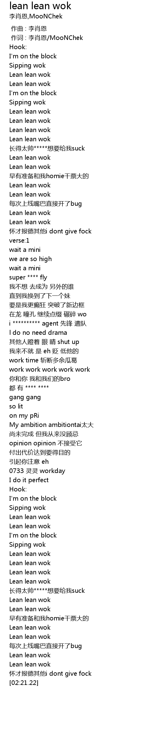 | [02:16.01] | Lean lean wok |