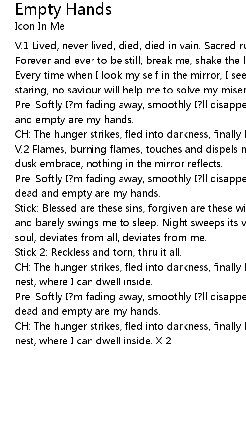 Pre: Softly I?m fading away, smoothly I?ll disappear, naked is the truth, dead and empty are my hands. |