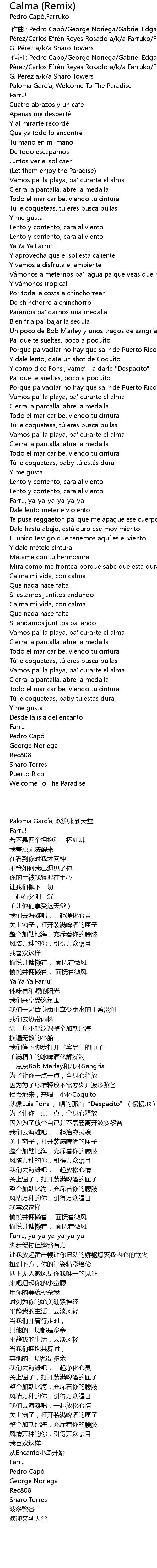 | [00:00.668] | 作词 : Pedro Capó/George Noriega/Gabriel Edgar González Pérez/Carlos Efrén Reyes Rosado a/k/a Farruko/Franklin Jovani Martinez/Marcos G. Pérez a/k/a Sharo Towers |