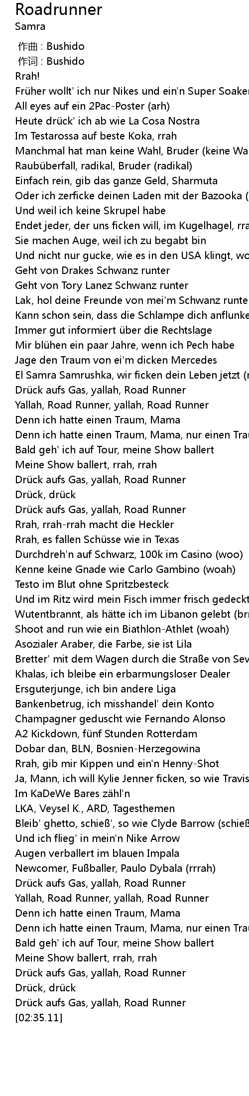 | [02:29.88] | Drück aufs Gas, yallah, Road Runner |