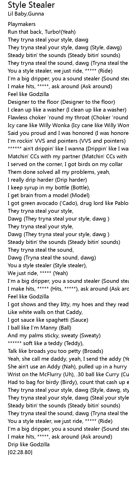 | [02:06.34] | They tryna steal your style, dawg (Steal your style, dawg ) |