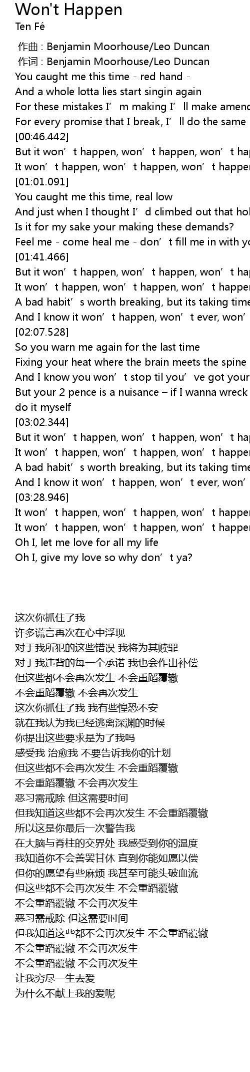 | [01:48.762] | It won' t happen, won' t happen, won' t happen again |