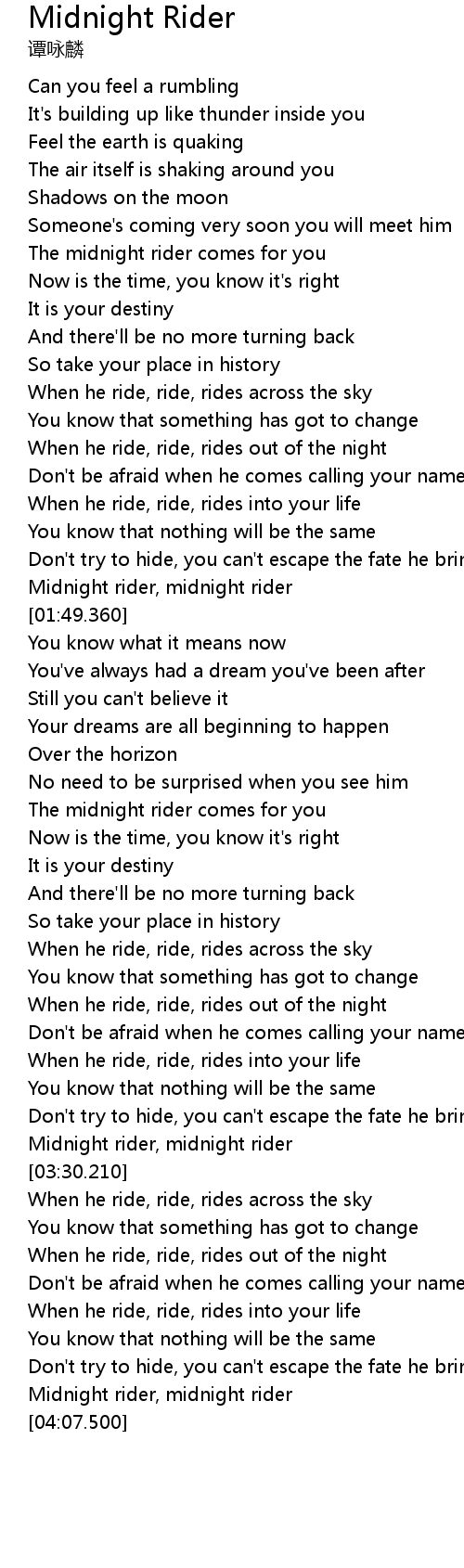 | [03:23.410] | Midnight rider, midnight rider |