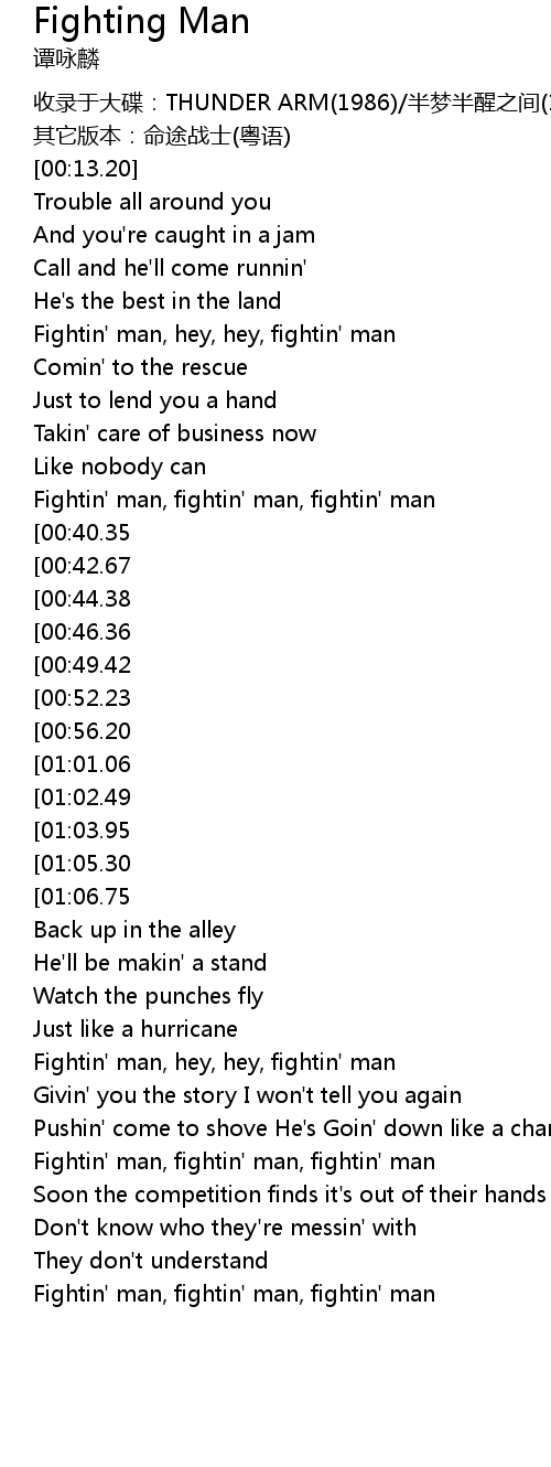 | [02:33.43][01:06.75] | Fightin' man, fightin' man, fightin' man |