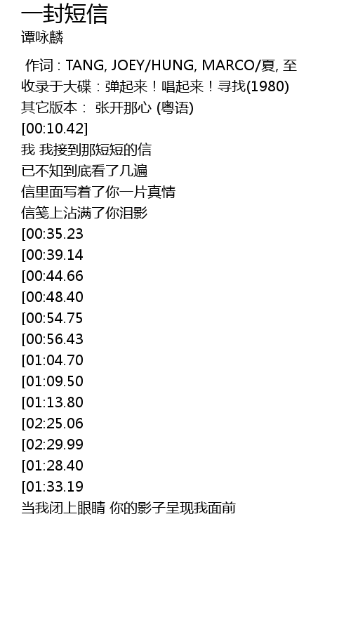 | [01:41.84][00:35.23] | zhè fēng duǎn xìn zhǐ jiān jiān jǐ jù |
