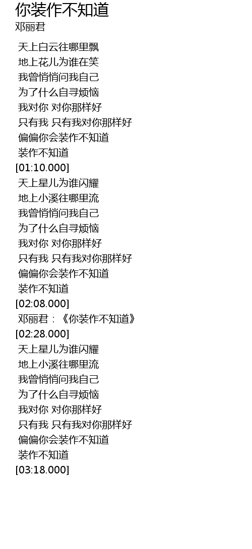| [02:10.000] | 邓丽君:《你装作不知道》 |