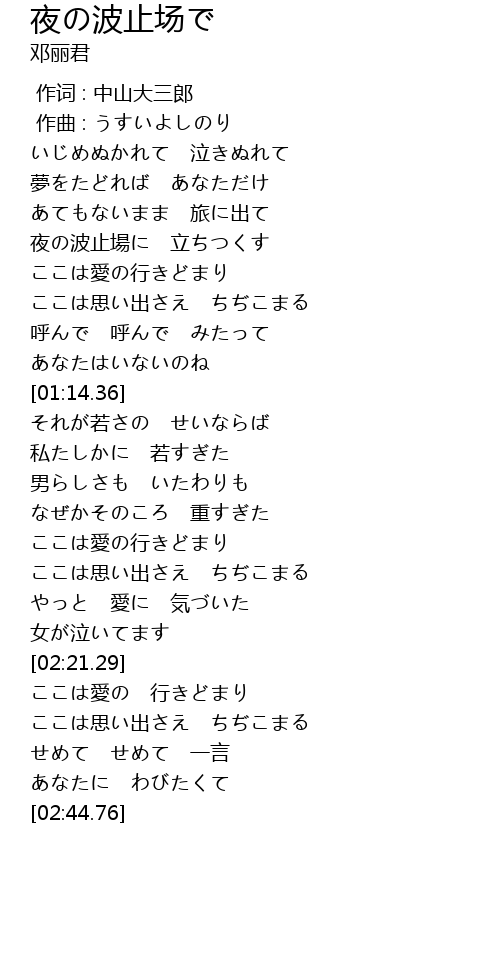 | [00:45.65] | 夜の波止場に 立ちつくす |