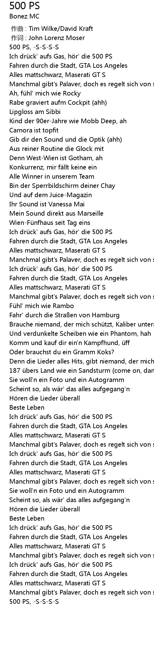 | [00:12.40] | Ich drü ck' aufs Gas, h r' die 500 PS |